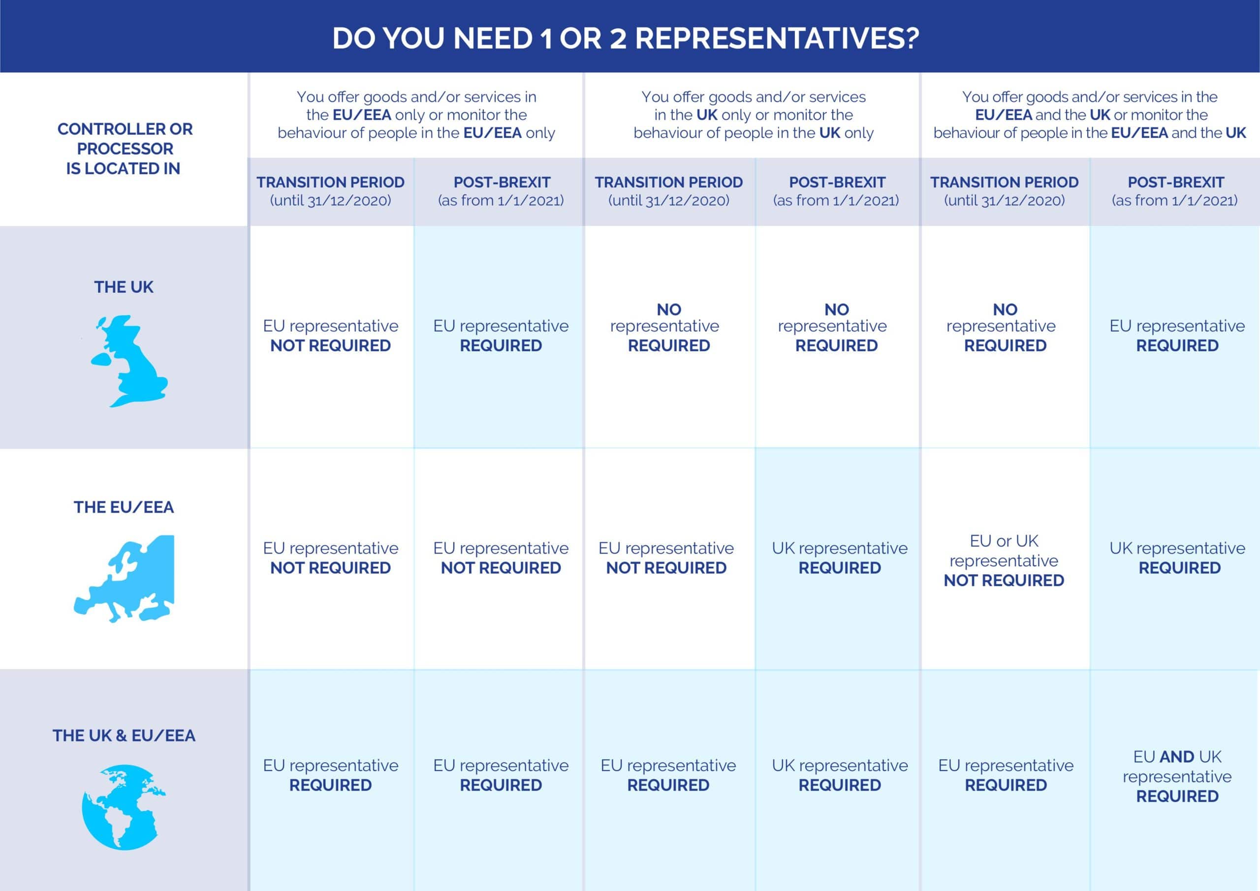 • EU companies that do business with the UK and process UK personal data will have to appoint a UK Representative, as the UK Government intends to require such an appointment when the Brexit transition period ends (i.e. 31 December 2020).