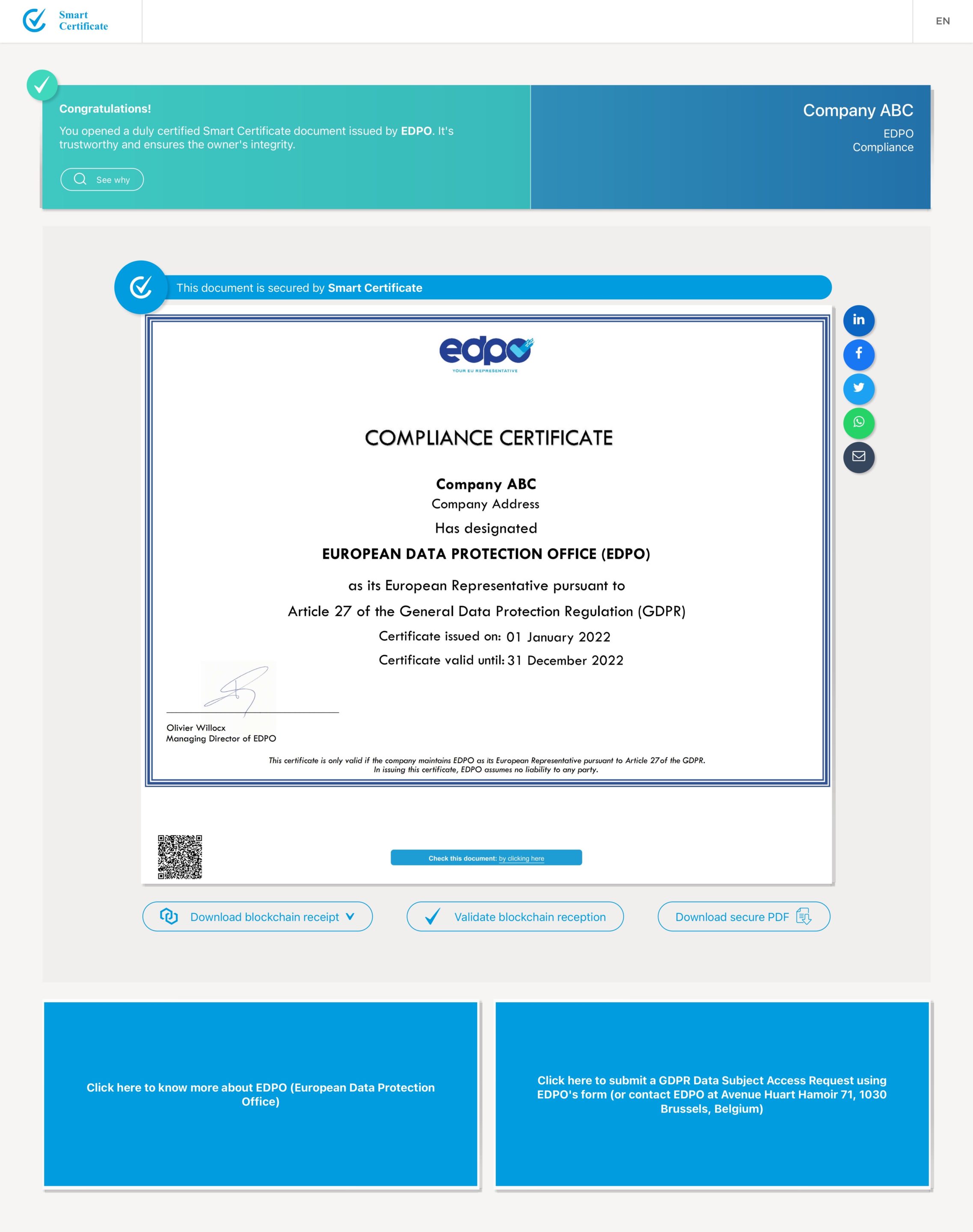Home » EDPO’s services for Japanese companies 日本企業にとってGDPRとは? GDPRの制裁を避けるために EU代理人を選任する必要があります。 無料診断テスト お問い合わせ GDPRが貴社に適用されていますか? 有償、無償に関わらず、EU域内にいる個人に対して商品やサービスを提供していますか? EU域内の個人の行動を監視しますか?(個人の行動履歴の追跡等) いずれかの質問に「はい」と答えた場合、貴社はおそらくGDPRの適用範囲に入り、 EU代理人を選任する義務があります。 EDPOはGDPRに関してEU代理人サービスを提供します。 EEA域内の各国(EU加盟国28カ国およびアイスランド、リヒテンシュタイン、ノルウェー)に所在する個人(データ主体)やデータ保護当局からの問い合わせに対して回数制限なく対応します。 個人データ侵害の通知に関する処理を回数制限なく対応します。 貴社のサイトや会社資料にEDPOの連絡先の詳細とロゴを使用する権利。 EDPOコンプライアンス証明書を使用する権利 GDPR関連のニュースおよび展開に関するお知らせ コンプライアンス証明書を入手 貴社が説明責任を保有し、GDPRの第27条へのあなたの遵守が検証可能であることを顧客に提示します。 信頼の構築と個人データの保護 貴社がEUのデータ保護基準を遵守していることを証明することで、より大きなビジネスチャンスを得ます 競争上の優位性を提供します 最大2,000万ユーロまたは全世界年間売上高の4%に相当する制裁金として課されるリスクを軽減します Smart Certificate?(スマート証明書)テクノロジーを使用して信頼性を保証します 今すぐお問い合わせください